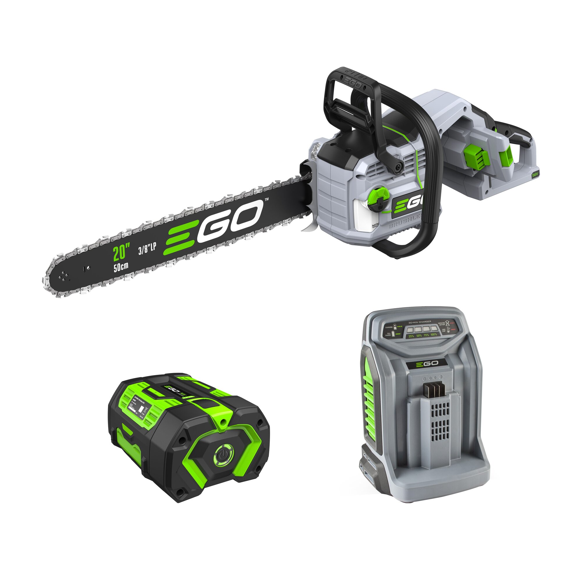 Výkonné LED světlo vám dokonale osvětlí pracovní prostor. Mazání řetězu je zde plně automatické a díky spolehlivému olejovému čerpadlu je podáváno příslušné množství mazacího oleje přímo do vodící drážky lišty. Konstrukci lišty a posuv řetězu dopraví každou kapku mazacího oleje přesně tam kde je to nutné. Pro kontrolu hladiny mazacího oleje je pila opatřena kontrolním olejoznakem. Na pohon pily lze použít jakoukoliv baterii ze sortimentu EGO. Naše lithiové baterie EGO Power+ 56V Arc Vám poskytnou dostatek energie pro pohon dostatečně výkonného a účinného bezkomutátorového elektromotoru s přímým náhonem na řetězku.